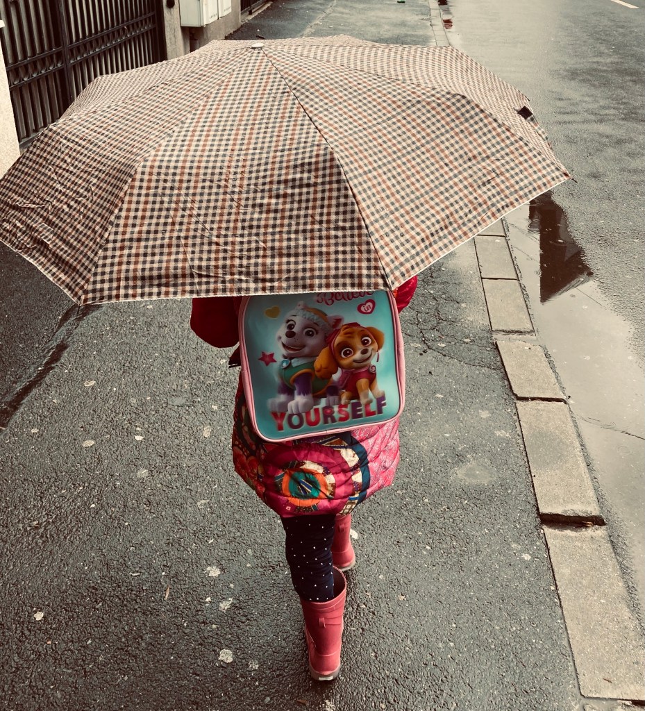Apoi imi ia umbrela, o desface, imi prinde si cateva fire de par in ea cu aceasta ocazie si decide ca ii trebuie ei, sa nu ii ude ploaia caciulita din lana. Pornim! Pe drum umbrela mea se izbeste pe rand ba de masini, ba de cosuri de gunoi. Copilul este tare fascinat de ea! Cu ochii in umbrela nu vede pe unde merge si se izbeste de un copacel… suntem bine.