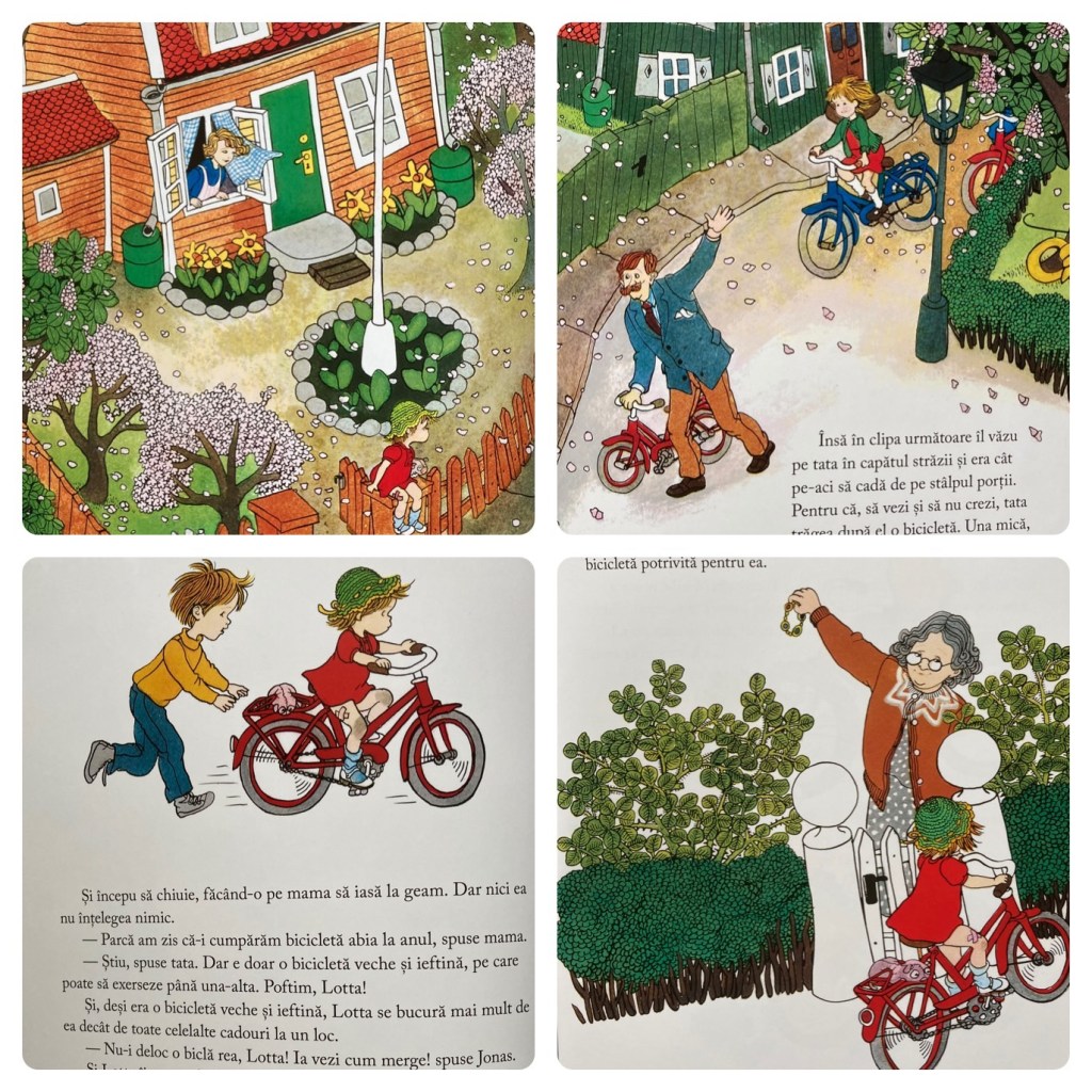 Noi fetele avem biciclete mici si usoare, rosii si cochete! Precum personajul favorit al fetitei noastre, Lotta de pe strada Zurbagiilor. Cum care Lotta? Lotta lui Astrid Lindgren! Mai bine zis a lui Ilon Wikland, caci ea a imaginat si desenat asa minune de fata.