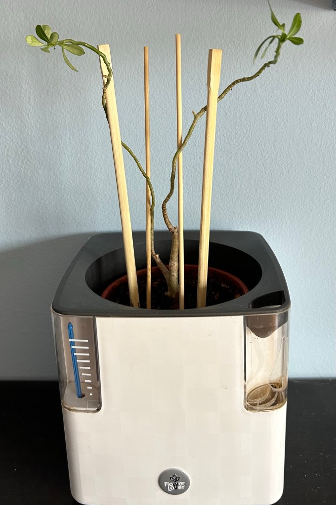 Ce este un baobab stiu 🙂 si cred ca avem unul, mititel tare. Vi-l arat imediat. Arata asa de peste 15 ani, ceea ce ma face sa concluzionez ca tare greu va creste mare. Cand l-am adus acasa, in 2005, avea 10 cm inaltime, un trunchi din care rasarisera 3 frunze si mi s-a spus ca ar fi un cactus :)) Dupa primii 5 ani de viata cu noi, un cuplu, a decis ca nu mai vrea sa fie singurel si din trunchi s-au desprins cele doua ramurele . Si cate 10-12 frunze. Si acum arata asa…