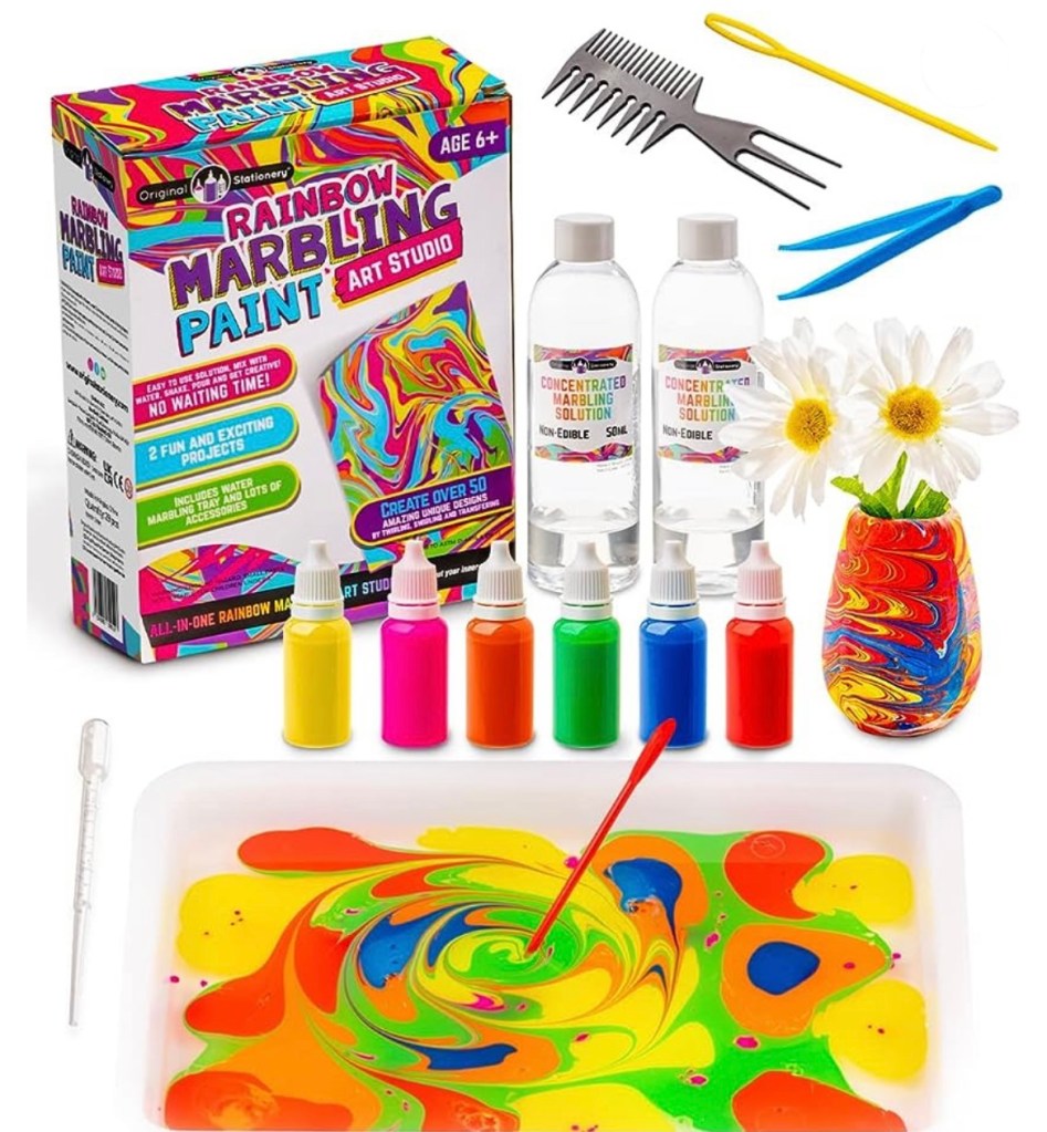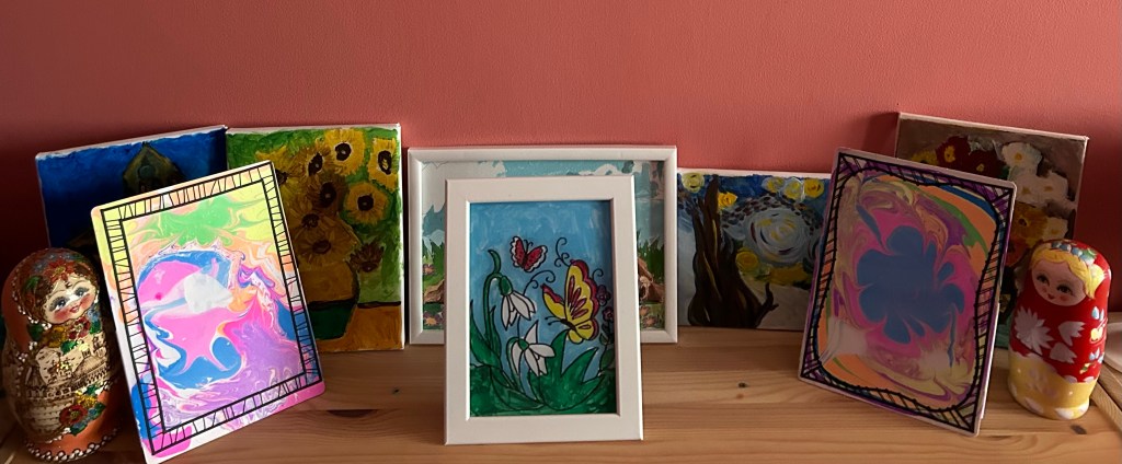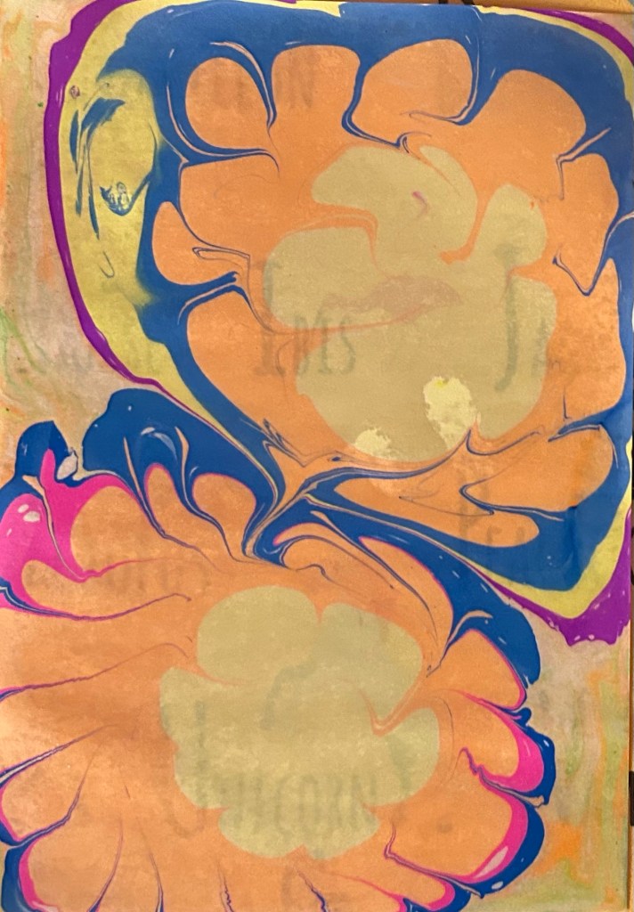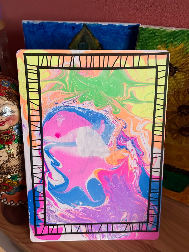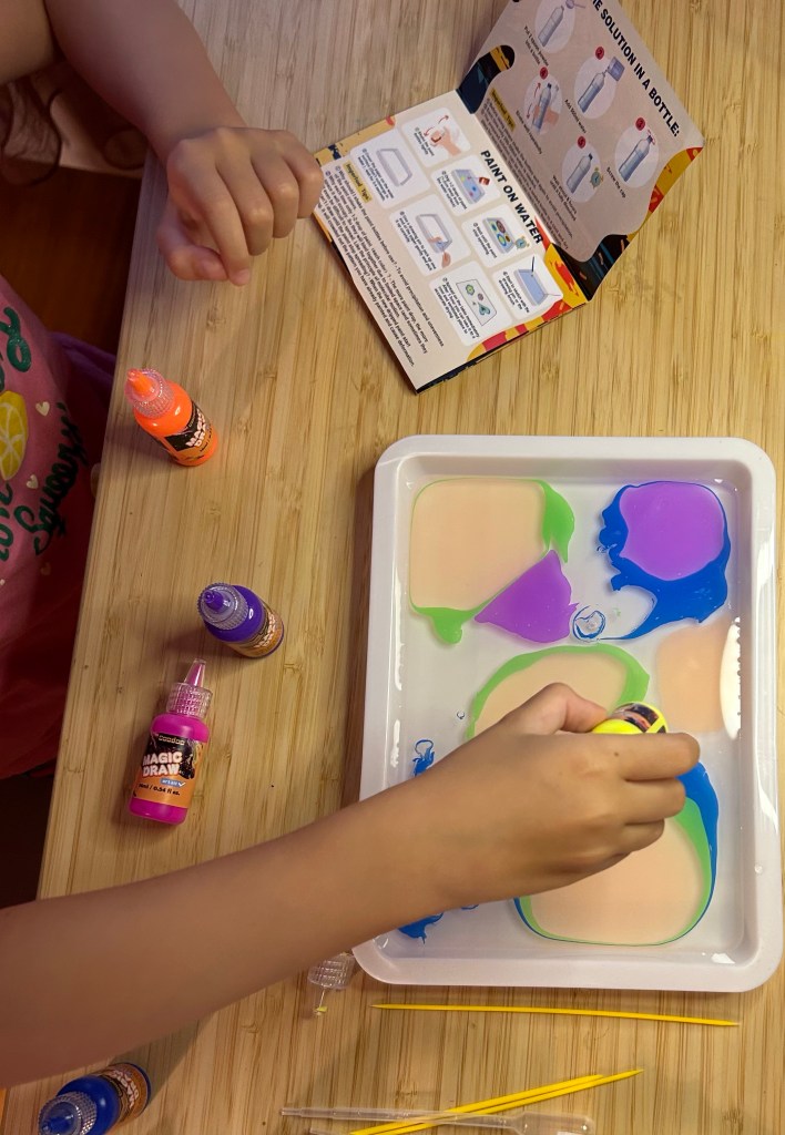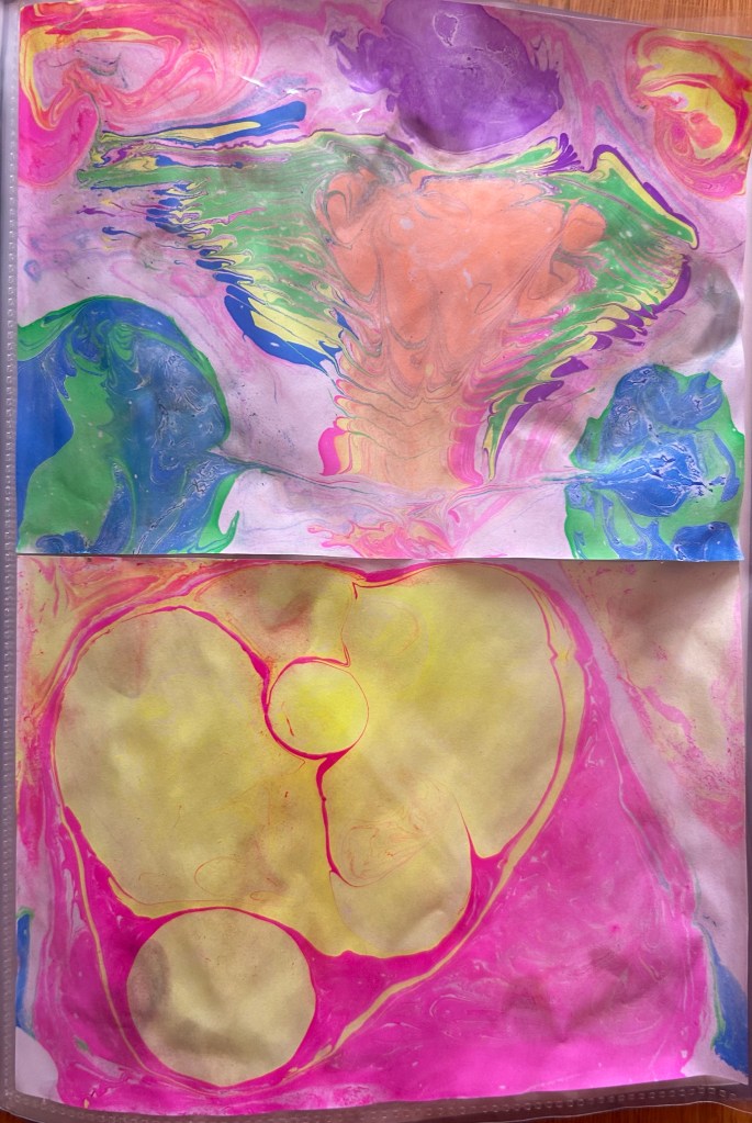 For the last 3 days, since the kit arrived, we paint all day with it. We aim for a heart, but until then, we enjoy our collection of marbled paitings.