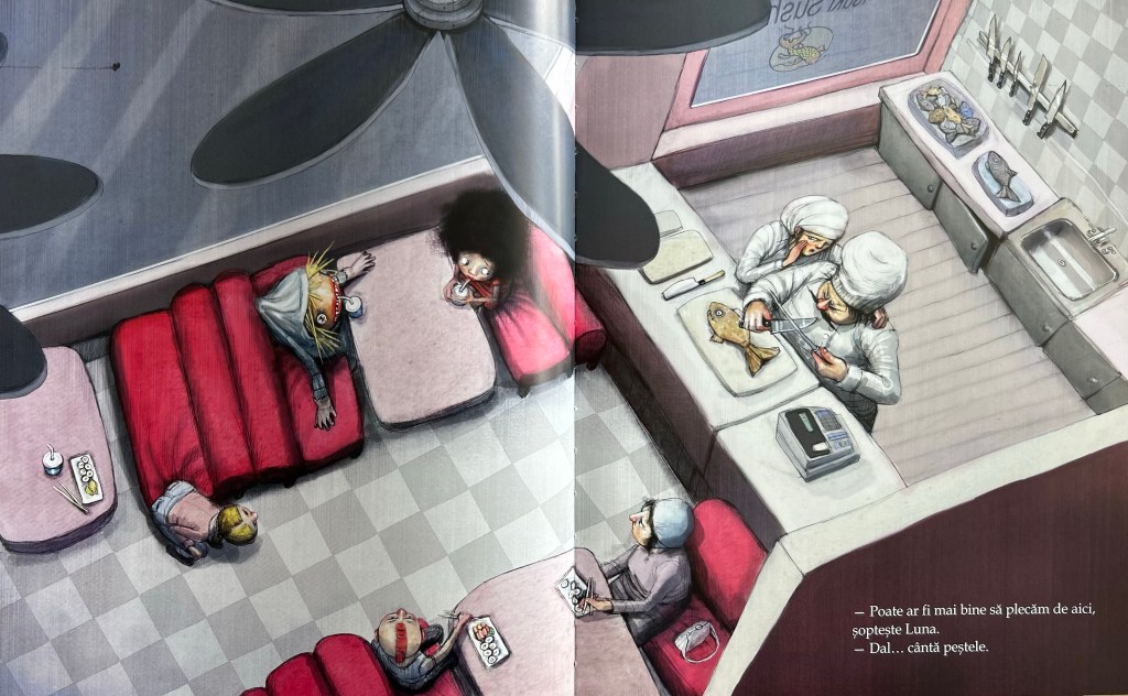 - Putin stranie, oferind cititorului o atmosfera distinctiva si unica. Poate ca multi gasesc ilustratiile artistei intrigante si misterioase, dar si profund evocatoare. Tonurile mai “dark” si imaginile neconvenționale contribuie la poezia si senzatia de reverie oferite de poveste. In acest fel, lumea Lunei pare in acelasi timp si una cunoscuta, familiara dar si una desprinsa parca dintr-un alt univers, dintr-un vis.