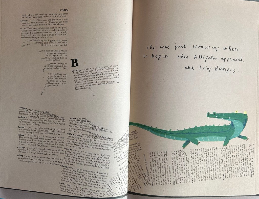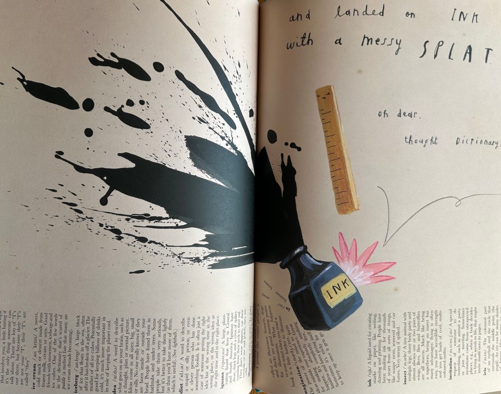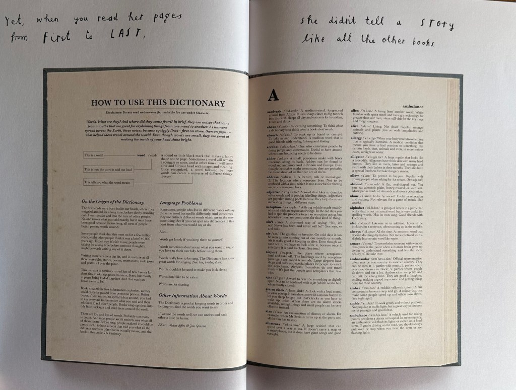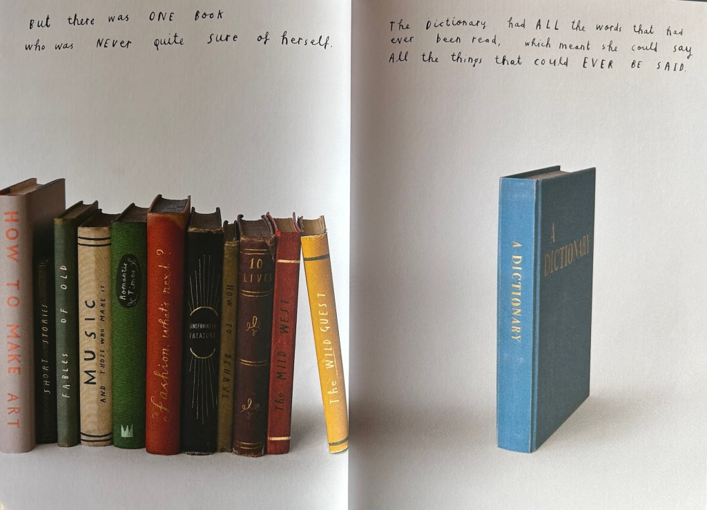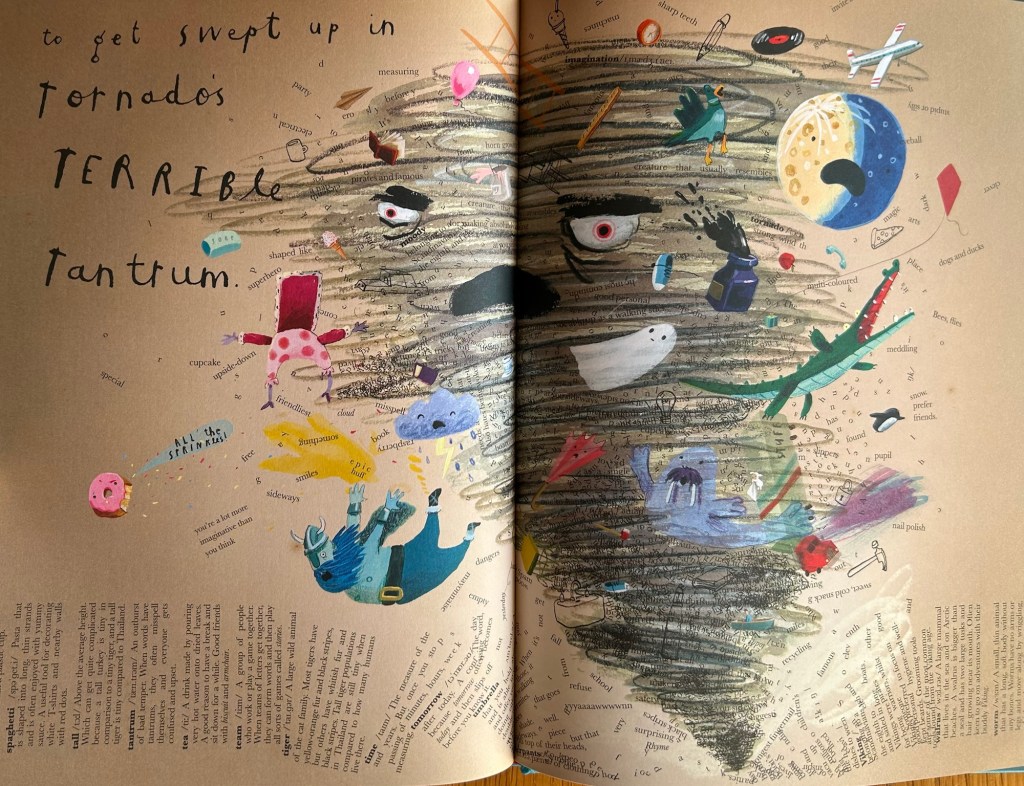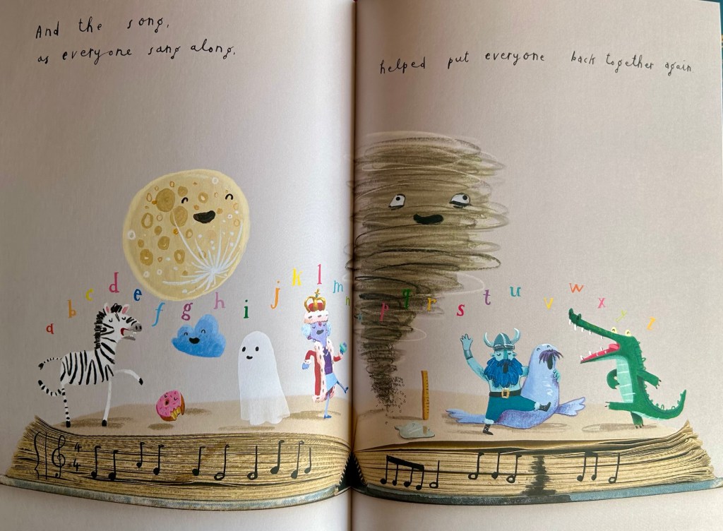 The most important book of all, the one’s keeping all the words in the world, would like to tell a story. How to do that? Who will help her do that? A hungry Crocodile, a Donut afraid to be eaten up, a Ghost, the Moon hershelf, the Queen and her Ruler, a Splash of ink and a Tornado!