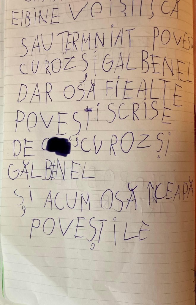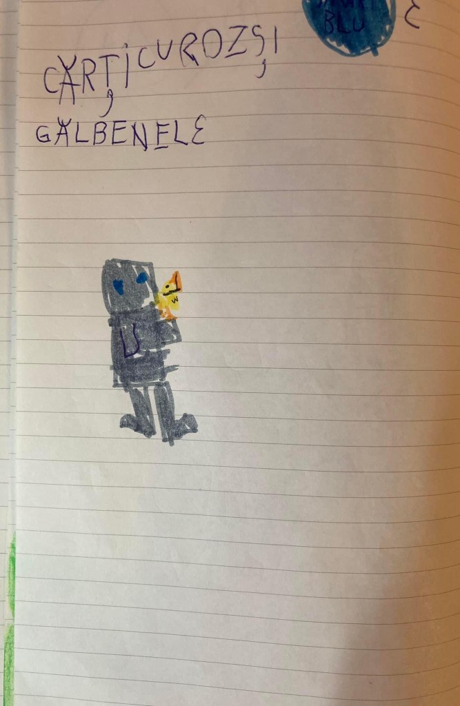 A inceput vacanta si noi facem planuri, de cand ne trezim pana adormim. Dupa zeci de intrebari legate de cate zile dureaza vacanta asta, cand plecam la bunici, cat de mult or sa se bucure bunicii sa o vada, cum or sa fie imbracati, ce aventuri ii pregatesc eu pentru fiecare zi de vacanta, copilul a anuntat ieri ca vrea sa scrie o carte… S-a facut liniste, inima mea a zambit si apoi am intrebat cu o voce mica despre ce ar vrea sa scrie. “Despre Roz si Galbenel si aventurile lor din cartea a 3-a. Ei vor povesti tot ce au facut dupa ce s-au intors pe insula.“ Si-a luat agenda si un pix si s-a apucat de scris; cum se pricepe ea sa scrie la 7 ani, nu m-a lasat sa corectez nimic. Doar sa citesc. Ar vrea insa sa o ajut la final sa arate si cartea ei la fel ca celelalte 2 carti. Si sa poata fi citita de toti copiii care o iubesc pe robotica si pe puiul ei. Pentru cei care nu au citit inca opera lui Peter Brown, este vorba despre cele doua volume “Insula robotilor” si “Intoarcere pe insula robotilor.” Nu credeam ca o carte si doua personaje vor avea un impact atat de puternic asupra ei. O carte pe care nici macar nu m-am gandit sa o cumpar, i-a imprumutat-o un prieten mai mare. S-a invatat cu personajele, astepta nerabdatoare in fiecare seara sa-i cititeasca tatal ei cateva capitole. Pana saptamana trecuta cand volumul II s-a terminat. Au trecut la alte carti, alte aventuri, dar cumva nevoia de a mai fi un pic alaturi de Roz si de puiul ei de gasca a gasit aceasta solutie: daca nu exista cartea a 3 a, o va scrie ea!